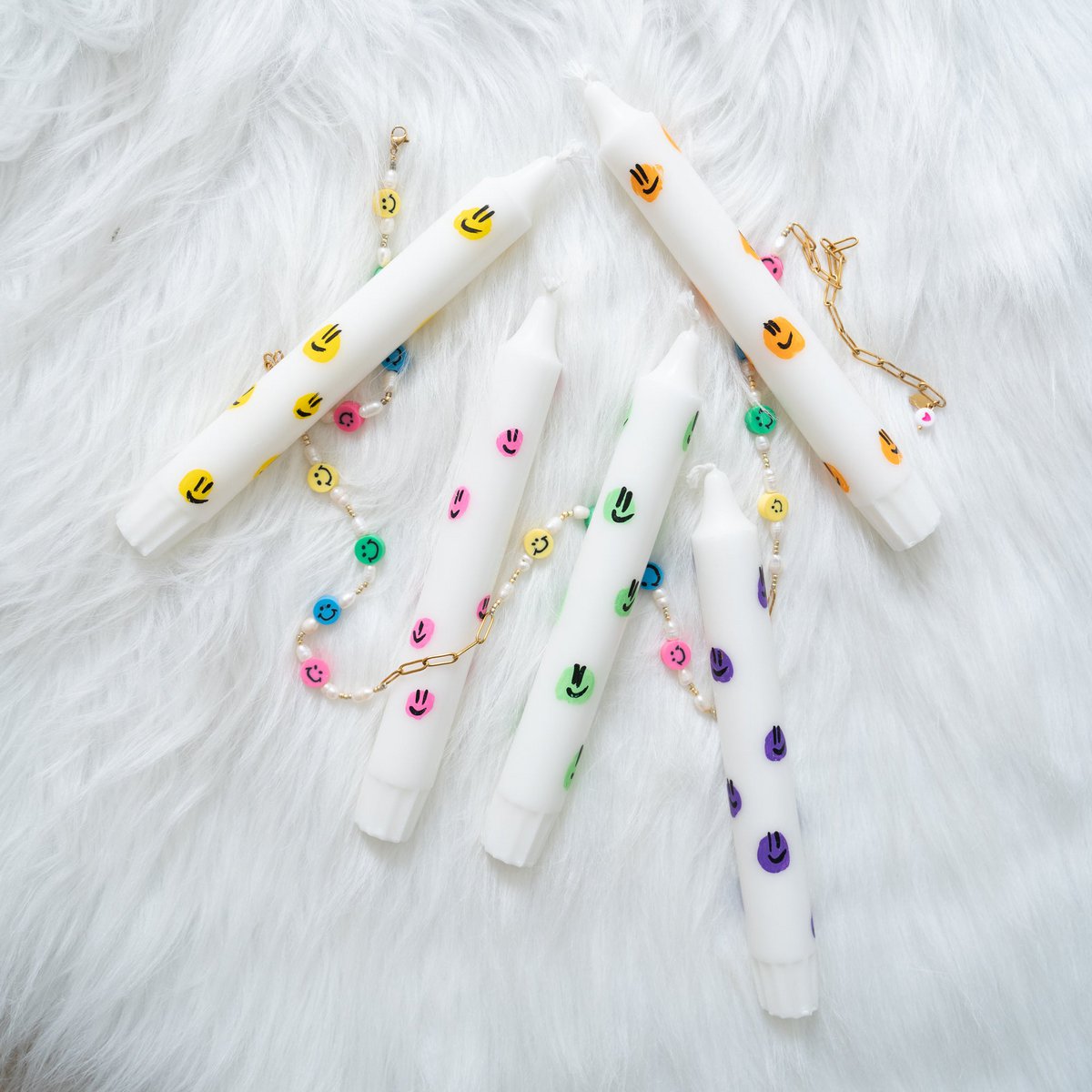 Deze set, met handgetekende kaarsen, brengt niet alleen licht in je kamer, maar ook een glimlach op je gezicht. De set bestaat uit vijf smiley kaarsen, elk in een unieke, opmerkelijke kleur, die samen een kleurrijk en vrolijk spectrum vormen. Het zijn niet zomaar kaarsen; het zijn kunstwerkjes die je interieur verrijken met hun vrolijke gezichten en levendige kleuren.